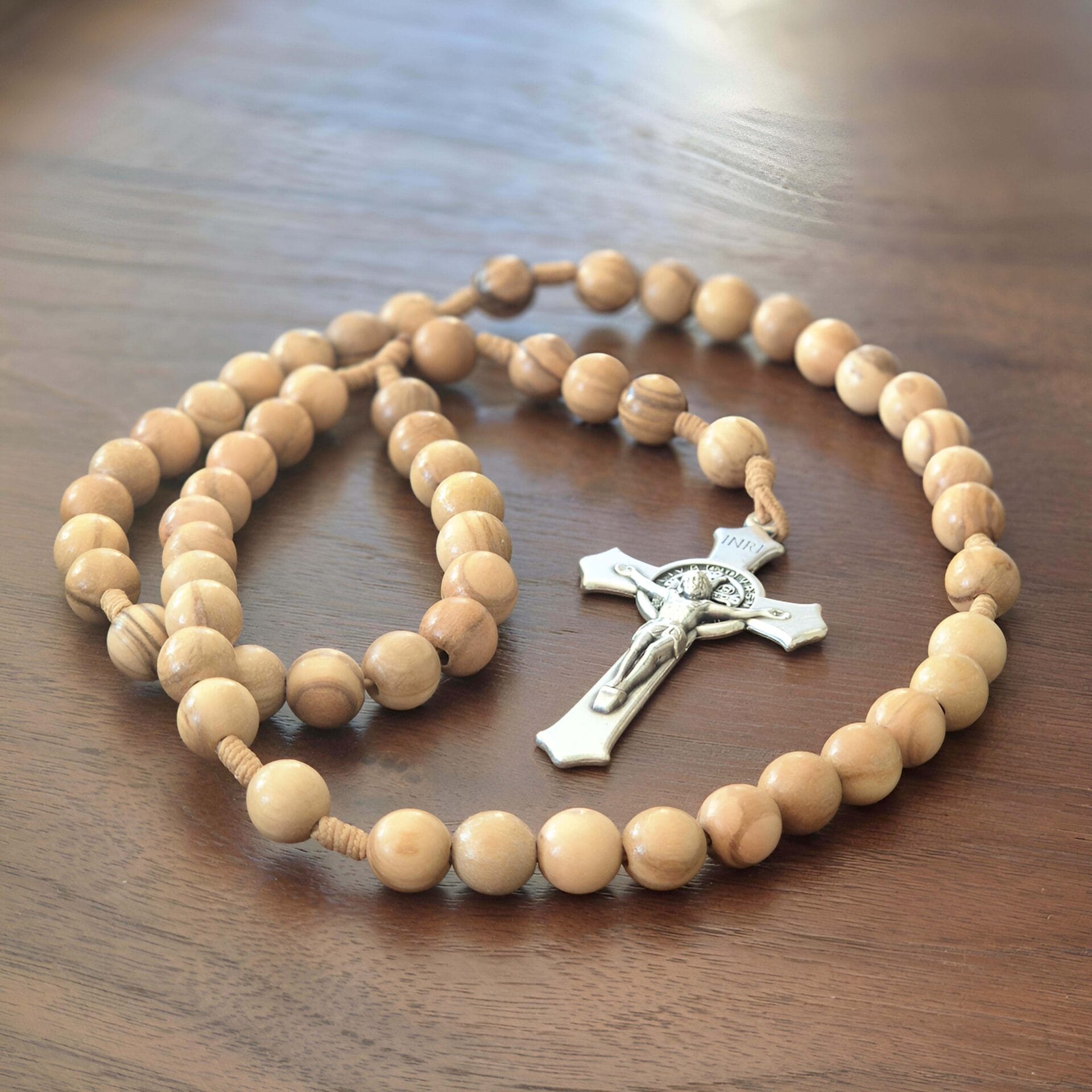 Šv. Jono seserų rankų darbo stambių alyvmedžio karoliukų rožinis.