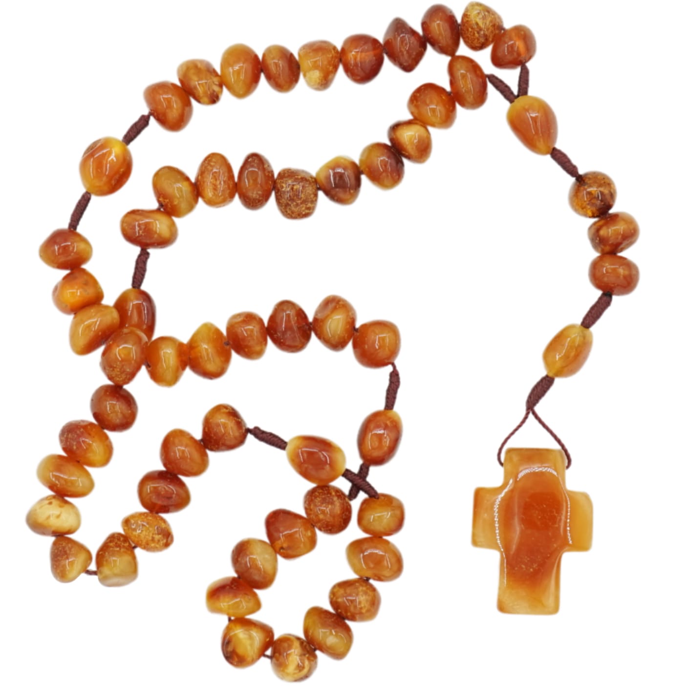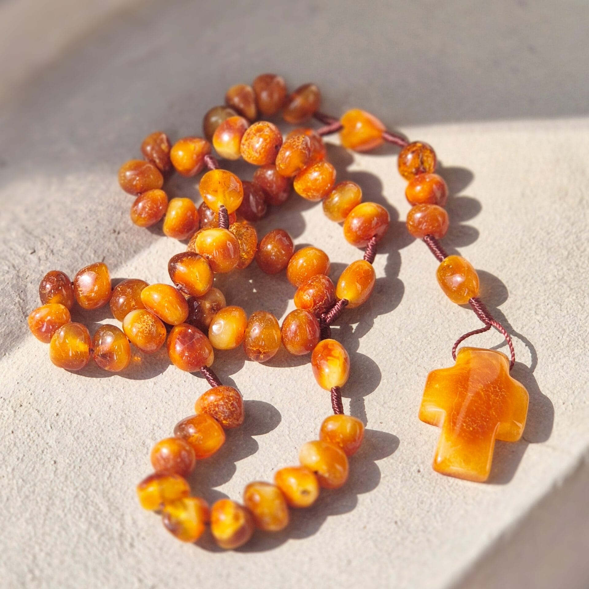 Rankų darbo išskirtinės spalvos gintaro karoliukų rožinis.