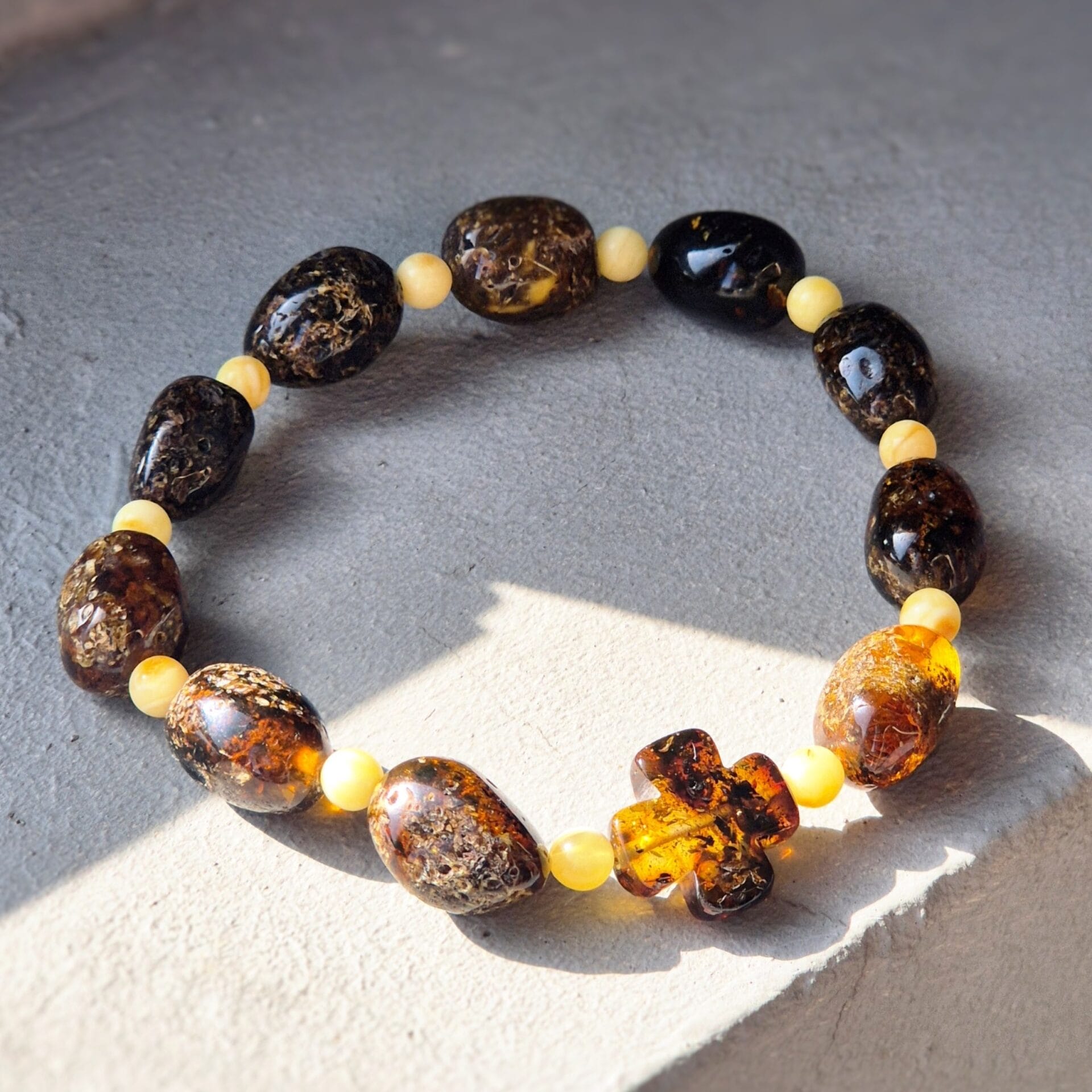 Rankų darbo gintarinis rožinis-apyrankė, suverta ant gumelės.