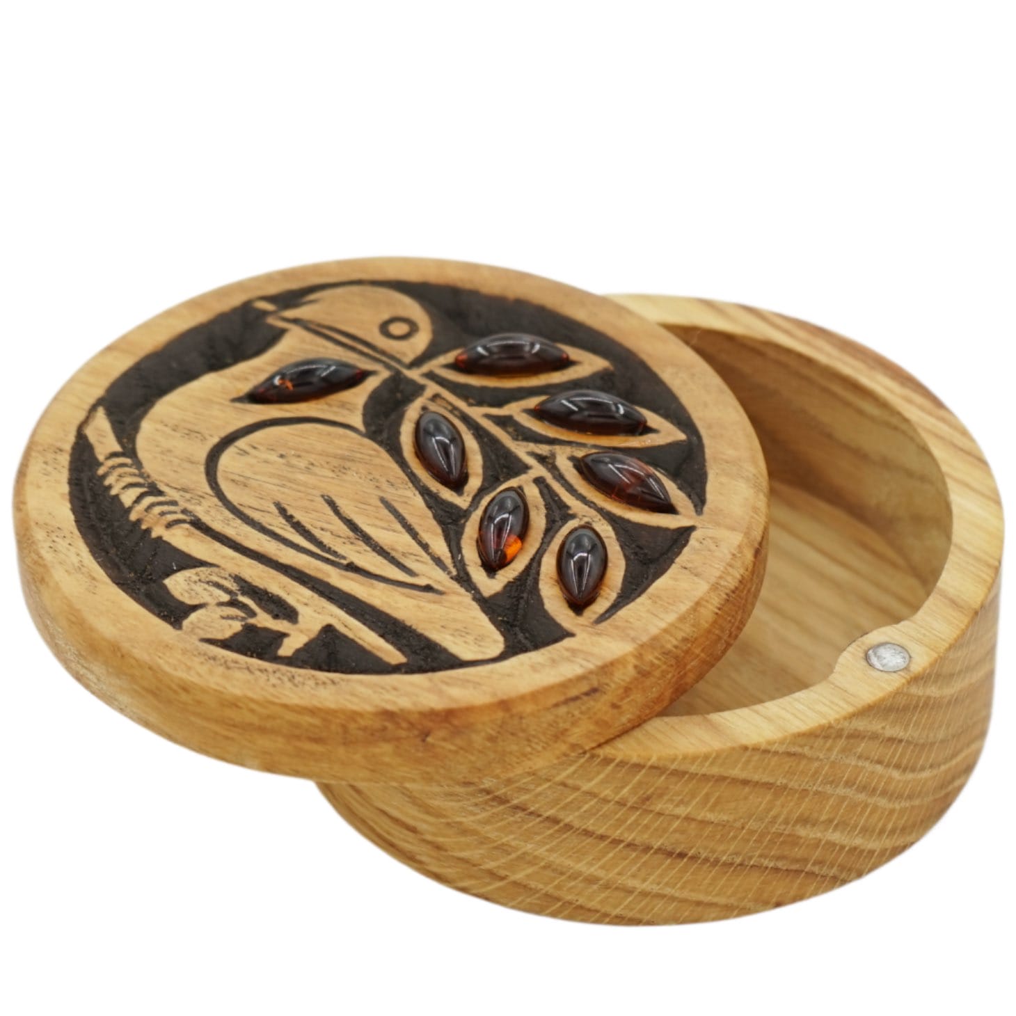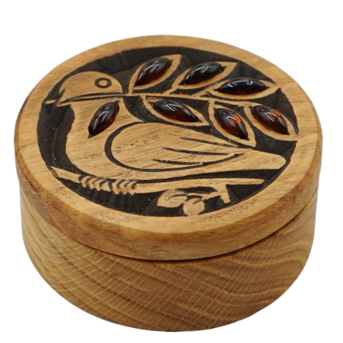 Gintaru papuošta ąžuolinė dėžutė „Balandis”