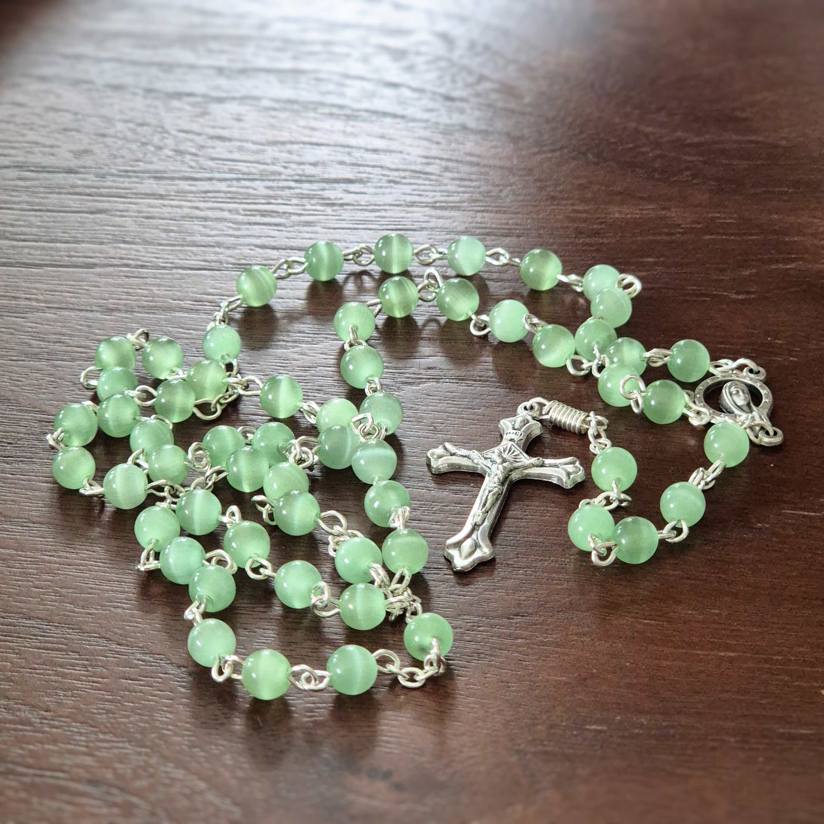 Šv. Klaros seserų rankų darbo katės akies karoliukų rožinis. Supakuota maišelyje.