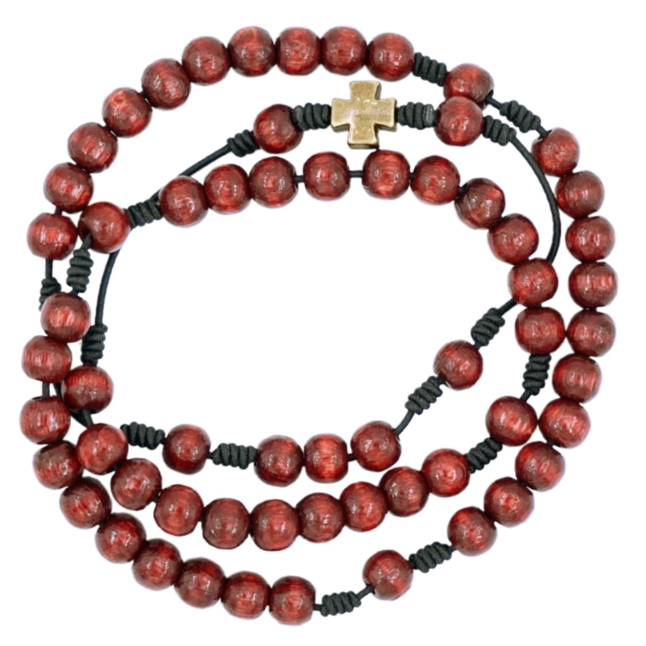 Šv. Jono seserų pagamintas medinių karoliukų 5 dalių rožinis-apyrankė, suverta ant gumelės.